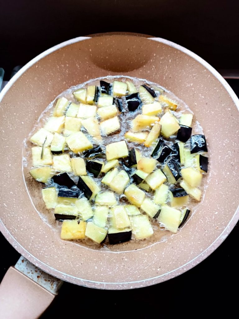 Nettoyez les aubergines et coupez-les en dés, mettez l’huile de tournesol à chauffer dans une poêle. Lorsque l’huile est bien chaude, faites rapidement frire les aubergines, mettez-les dans un bol et assaisonnez avec une pincée de sel fin.