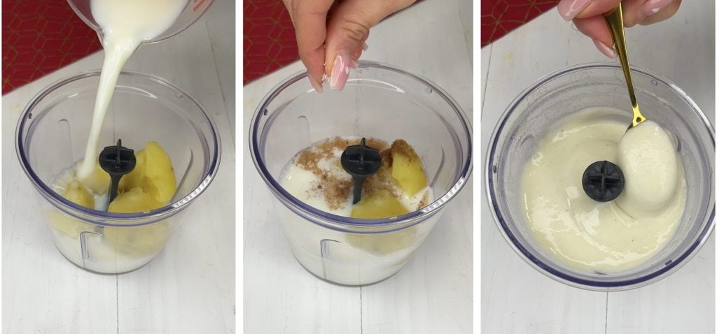 Entre-temps, nous préparons une crème d’accompagnement très facile : dans un mixeur, nous réunissons les pommes de terre restantes (environ 3), le lait tiède, une pincée de sel et la noix de muscade. Nous mixons pour obtenir une crème lisse et veloutée.