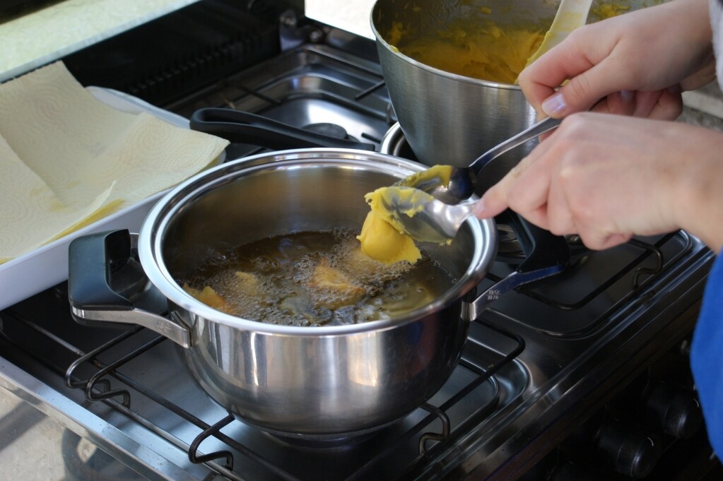 Avec l’aide de deux cuillères, formez des boules de pâte d’environ 2 cm et plongez-les dans l’huile chaude.