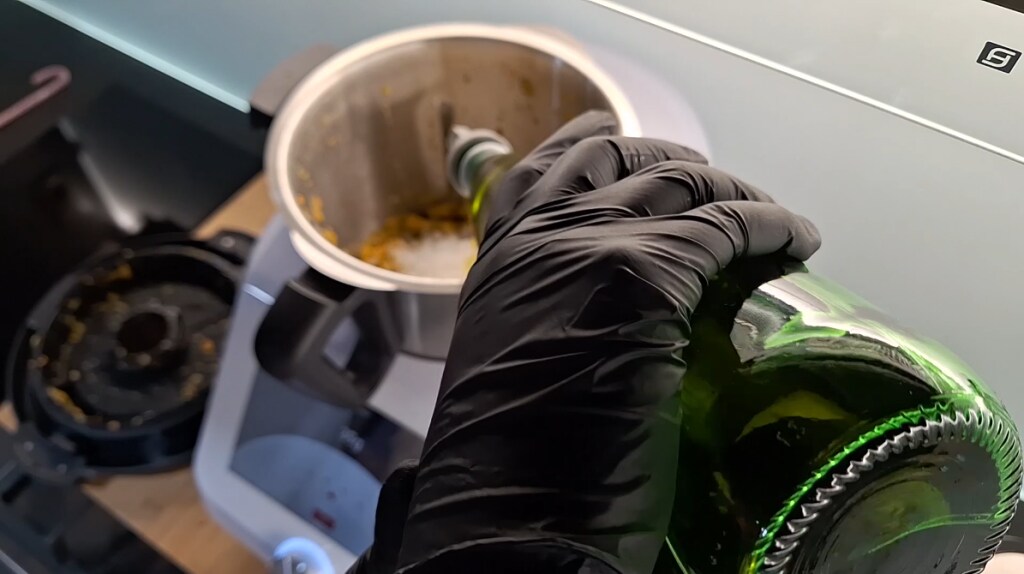 Mets le mélange dans le bol propre et sec du Monsieur Cuisine Smart, ferme le couvercle et appuie sur le bouton central pour lancer un tour de turbo de 1 seconde.
