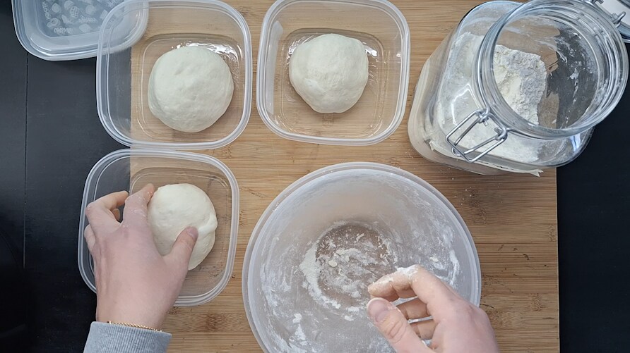 Détachez 5 pâtons de tailles similaires (ou 4 pour des pizzas plus grandes, mais déconseillé pour les petits fours à pizza).