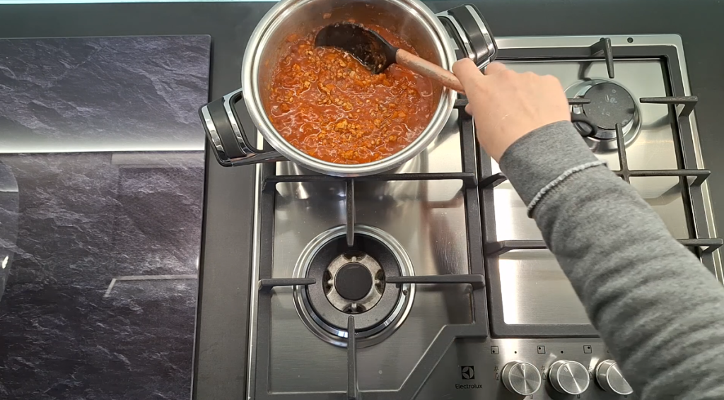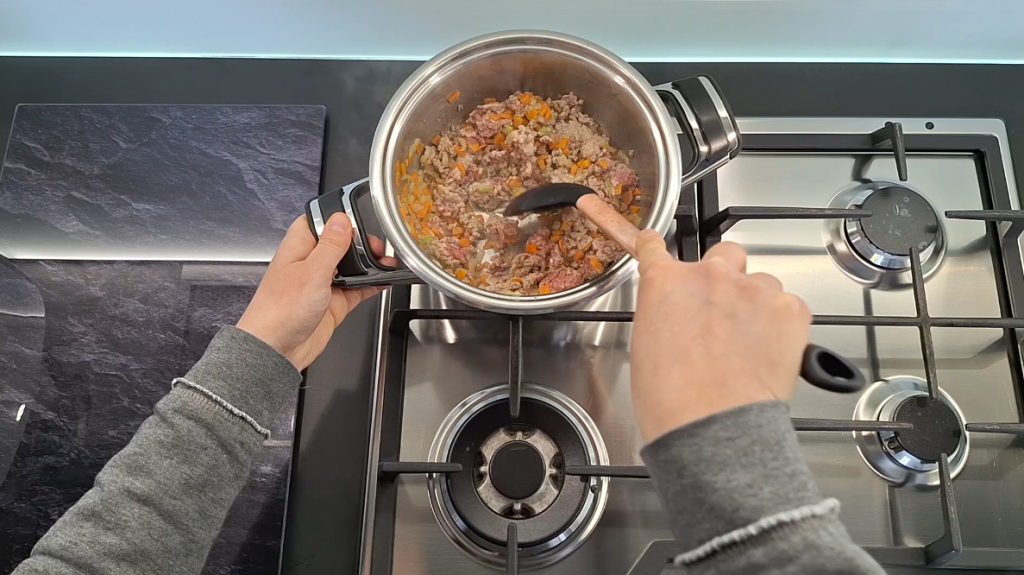 Une autre étape qui fait la différence est la rissolature de la viande. Au début, il vaut mieux ne pas la remuer immédiatement, mais la laisser quelques instants en contact avec le fond chaud de la casserole. De cette façon elle prend plus de goût. Ensuite, tu peux l’émietter correctement avec la cuillère, ainsi le ragù reste fin et bien réparti.