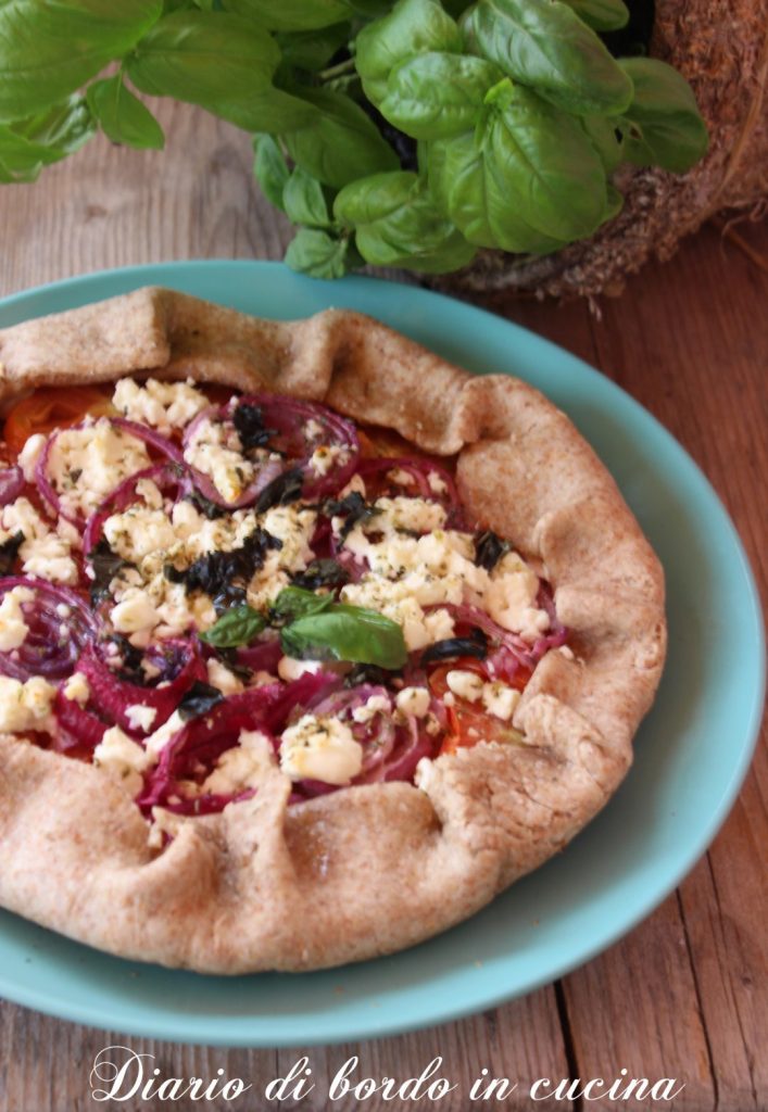 Galette rustique avec tomates oignon et feta, une tarte rustique, riche en fibres, pour une pâte sous le signe du naturel et de l’authenticité. La garniture est très savoureuse, un mélange de saveurs donné par l’acidité des tomates, atténuée par la douceur de l’oignon qui est à son tour mise en valeur par la salinité de la feta. À essayer pour le croire !