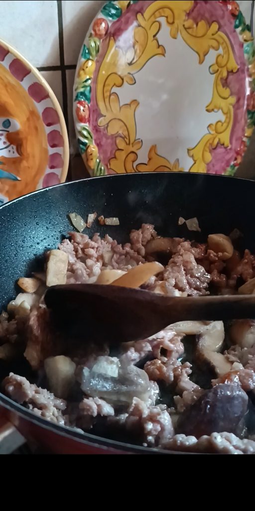 • Dans une poêle avec de l’huile d’olive, fais dorer l’ail et l’oignon. Retire l’ail, ajoute la saucisse épluchée, fais bien revenir et ajoute les champignons nettoyés et coupés. Laisse cuire pendant 15 minutes.