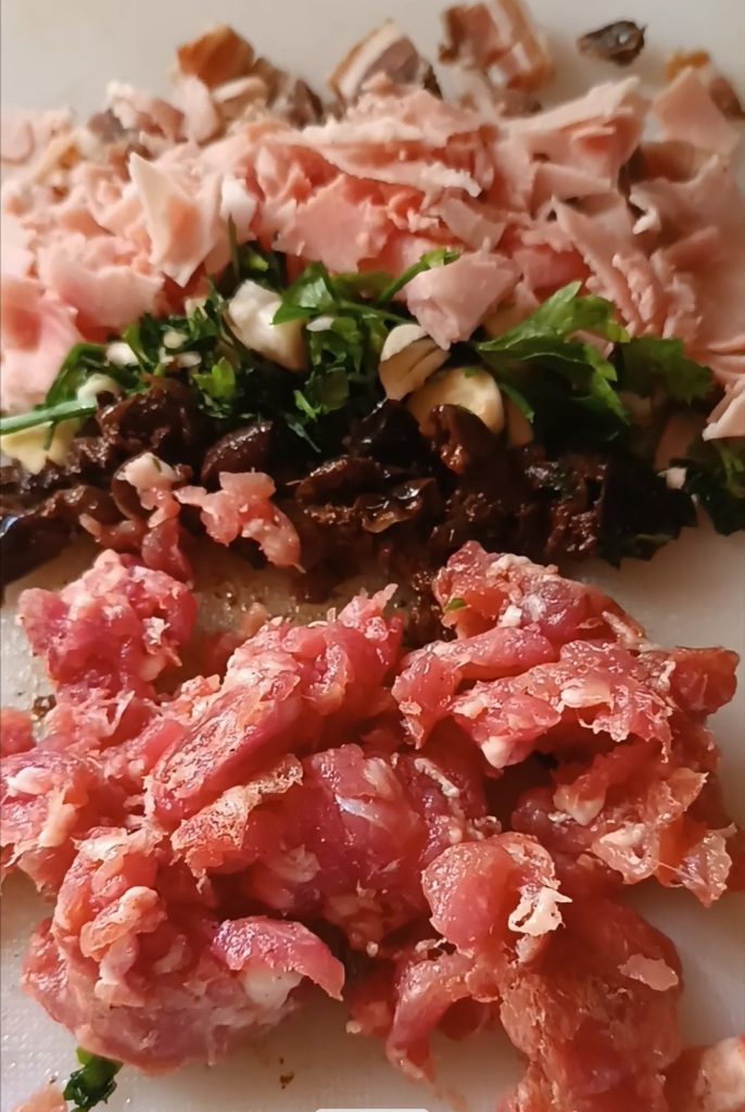 Couper le lard, le jambon cuit, les olives, le persil et l’ail en petits morceaux.