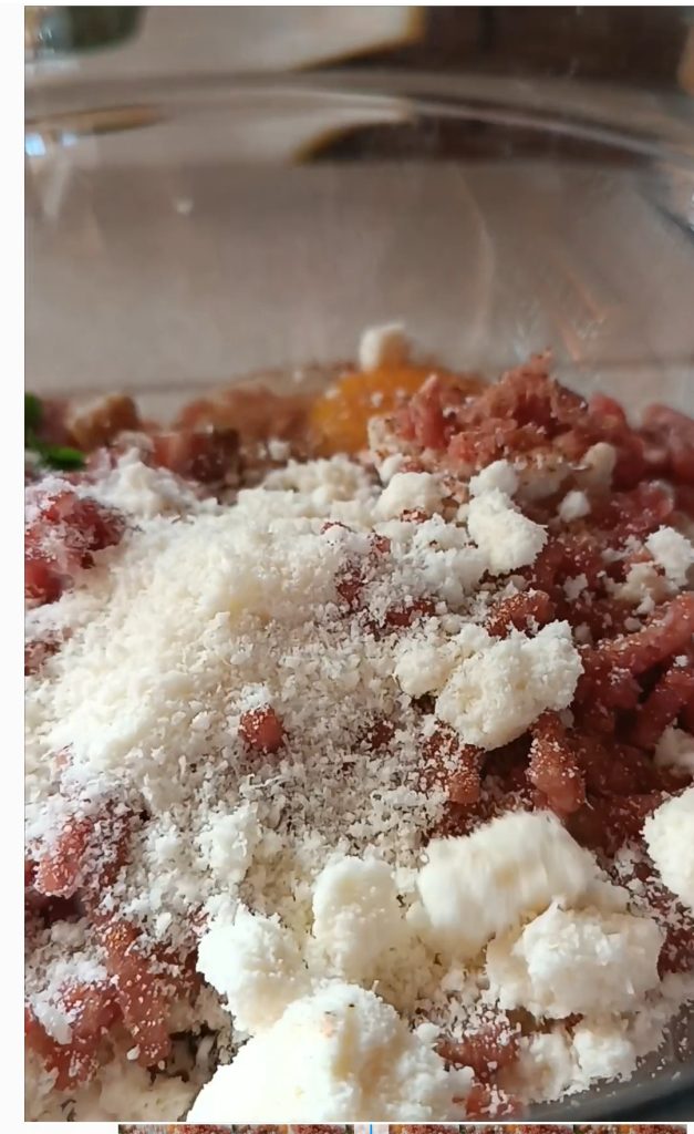 Verser le tout dans un bol, ajouter la saucisse pelée, la mie de pain préalablement trempée et essorée, la viande hachée, la noix de muscade, à volonté aussi du fromage râpé, l’ail en morceaux, les olives, le sel et pour lier le tout, ajouter l’œuf.