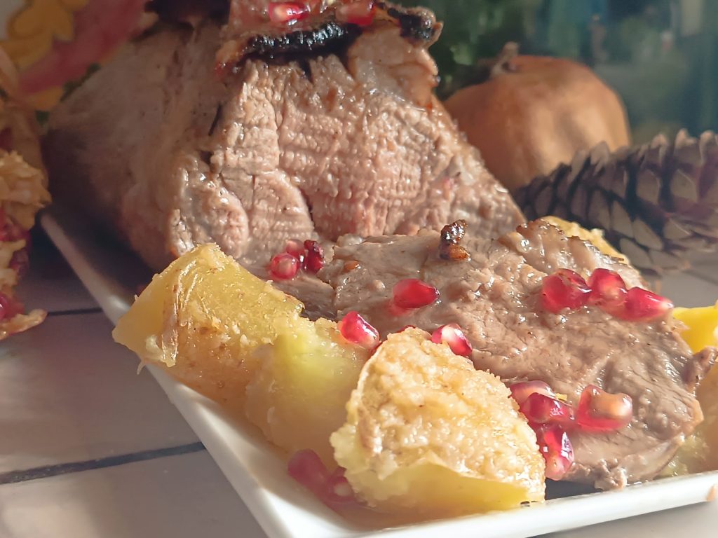 Rôti de porc à la grenade, un plat principal de viande, tendre et juteux. C’est le plat principal idéal pour les fêtes de Noël, en plus d’être simple à préparer, on peut anticiper la préparation. De plus, il se présente bien aussi, les grains de grenade portent chance à ce plat, le rendant adapté au repas de fin d’année. Pour accompagner ce plat déjà riche, il suffira simplement de pommes de terre au four.