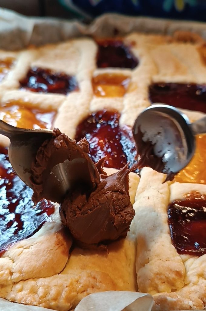 remplissez les espaces avec la confiture en alternant les goûts. Laissez quelques espaces vides, ils seront remplis après la cuisson avec le chocolat. Cuire à 180° pendant environ 25 minutes.