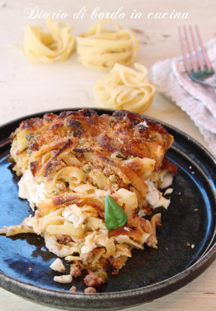 Tarte de tagliatelles, un plat principal de la tradition campanienne, préparé avec un ragoût blanc et de la béchamel. C’est un plat principal très copieux, souvent enrichi par l’ajout de charcuterie ou de jambon. Dans cette version, j’ai assaisonné les tagliatelles avec un ragoût blanc très rapide et j’ai ajouté de la provola fumée. C’est un plat principal à préparer à l’avance, vous permettant d’organiser au mieux les repas de famille, à enfourner quand vous le souhaitez.