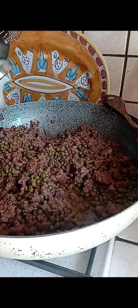 • Commençons par préparer un ragoût blanc. Dans une poêle avec de l’huile d’olive, faire revenir l’oignon, ajouter la viande hachée. Émietter bien avec une fourchette, saler et déglacer avec le vin blanc. Ajouter les petits pois, si vous utilisez des petits pois surgelés, ils doivent être blanchis d’abord. Faire cuire le ragoût pendant environ 30 minutes.