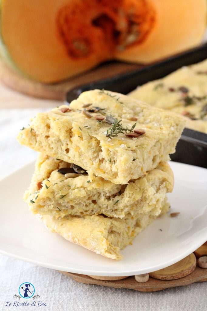 Comme anticipé, j’avais une belle grande citrouille cette fois et j’ai réalisé plusieurs recettes avec. La première est la velouté de citrouille sans pommes de terre, déjà publiée sur le blog. Puis cette délicieuse et savoureuse focaccia et ensuite, dès que j’aurai le temps d’écrire la recette, vous trouverez la citrouille rôtie avec des éclats d’amandes.