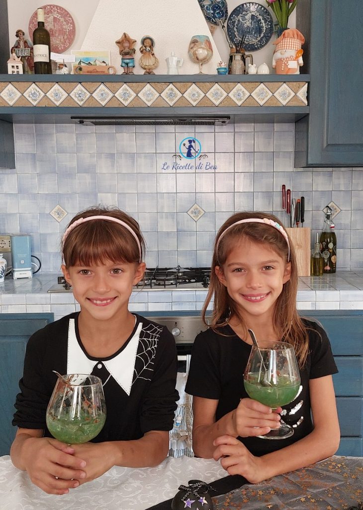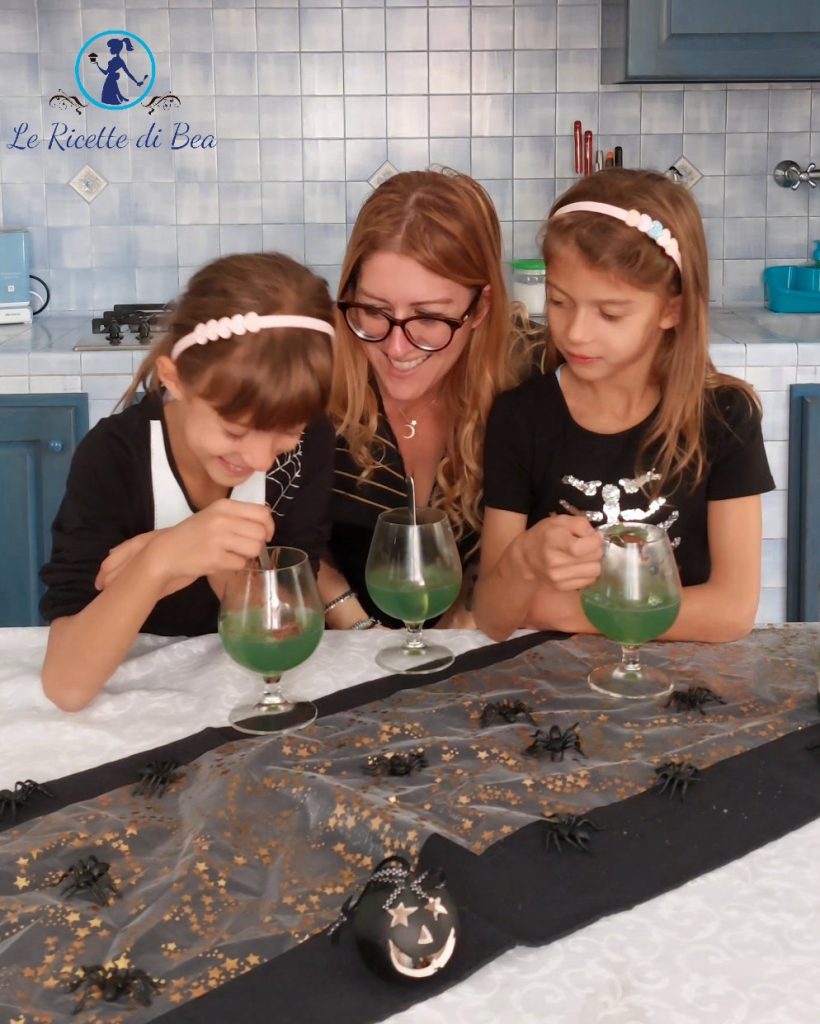 Un dessert à la cuillère facile à préparer, rapide et avec peu d’étapes et d’ingrédients. Vous pourrez le préparer avec les plus petits comme je l’ai fait avec Rebecca et Melissa, nous avons préparé ce dessert et nous l’avons ensuite dégusté pour le goûter. Nous nous sommes amusées en préparant cette gelée d’un vert intense, au parfum inoubliable. costumées en sorcières, nous avons préparé cette potion colorée et gourmande!