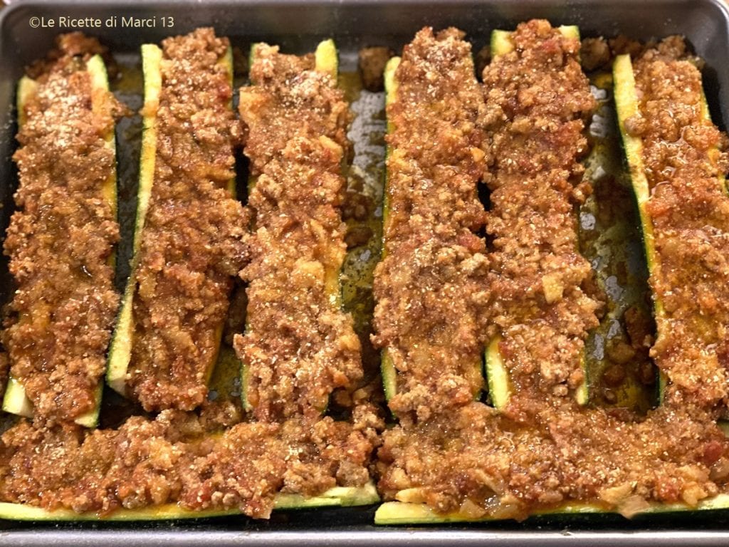 Laissez refroidir la préparation de viande, pendant ce temps salez l’intérieur des courgettes et remplissez-les avec la farce préparée. Prenez une plaque de cuisson, graissez-la avec de l’huile d’olive extra vierge et disposez les courgettes farcies, saupoudrez de chapelure et enfournez à 180 degrés pendant environ 40 minutes.