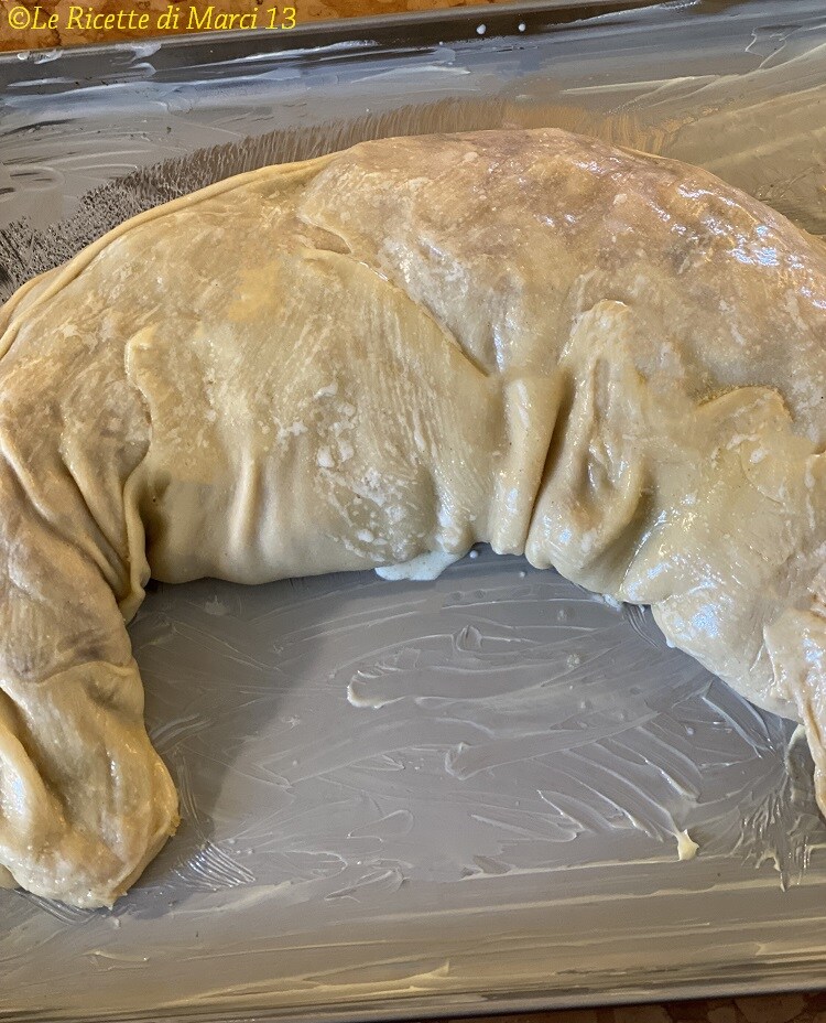 À ce stade, toujours avec l’aide du torchon, transférez le strudel sur une plaque (ou une lèchefrite) recouverte de papier sulfurisé puis bien beurrée et à la fin essayez de garder la partie de la fermeture en dessous. Enfin, badigeonnez bien toute la surface du strudel avec les 40 g de beurre fondu restants.