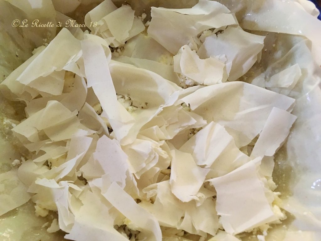 • Faites une autre couche de haillons de pâte filo (même déchirés en morceaux plus grands) feta, parmigiano.