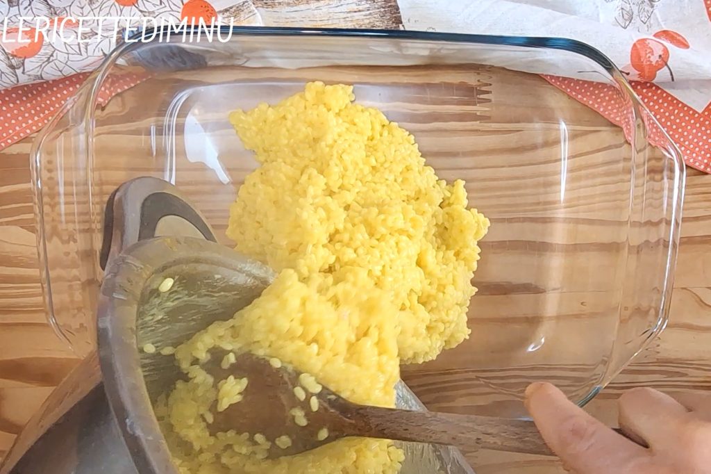 Après le temps de refroidissement de la sauce et du riz, préparer la pâte qui ne doit pas être dense, mais moyennement liquide. Pour cela, travailler avec un fouet manuel la farine et l’eau et incorporer l’œuf.