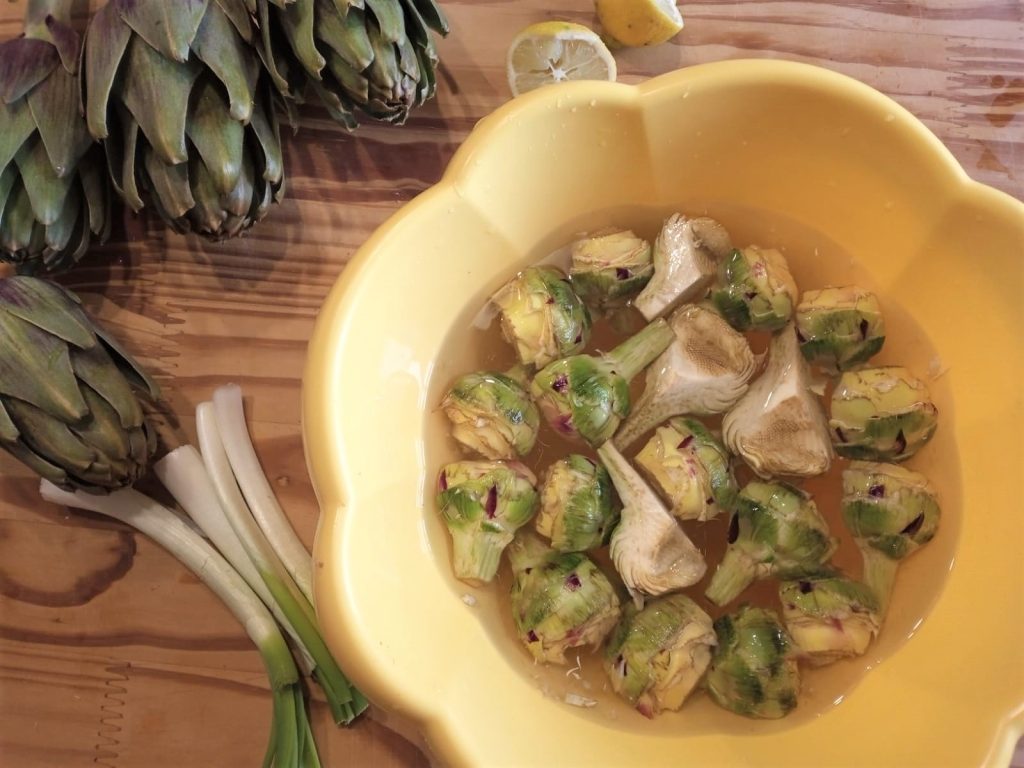 Pour préparer l’accompagnement d’artichauts pommes de terre et petits pois, commencez par préparer un bol rempli d’eau acidulée avec le jus d’un citron.