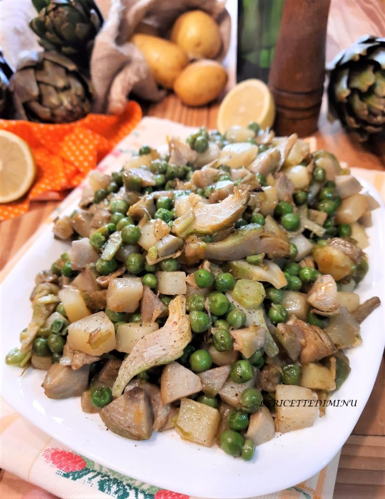 Les artichauts avec pommes de terre et petits pois sont un excellent accompagnement idéal pour accompagner au mieux rôtis, pâtés de viande blanche ou rouge, etc.… ainsi que pour enrichir de saveur une simple tranche grillée d’un jour ordinaire.
