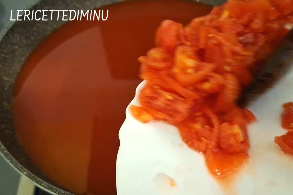 Pendant ce temps, mettre sur le feu une petite poêle antiadhésive contenant la sauce et les six tomates pelées, épépinées et coupées en morceaux.