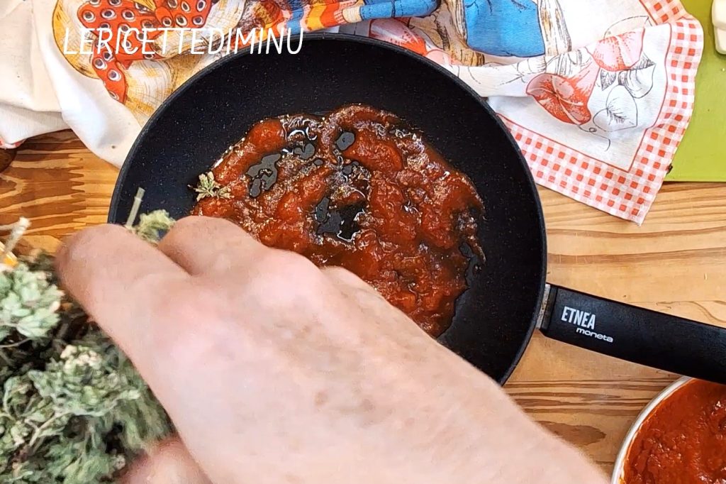 Sur le fond d’une poêle antiadhésive, répartir quelques cuillères de sauce cuite et quelques cuillères à café d’eau, parfumer avec un peu d’origan et de poivre noir fraîchement moulu.