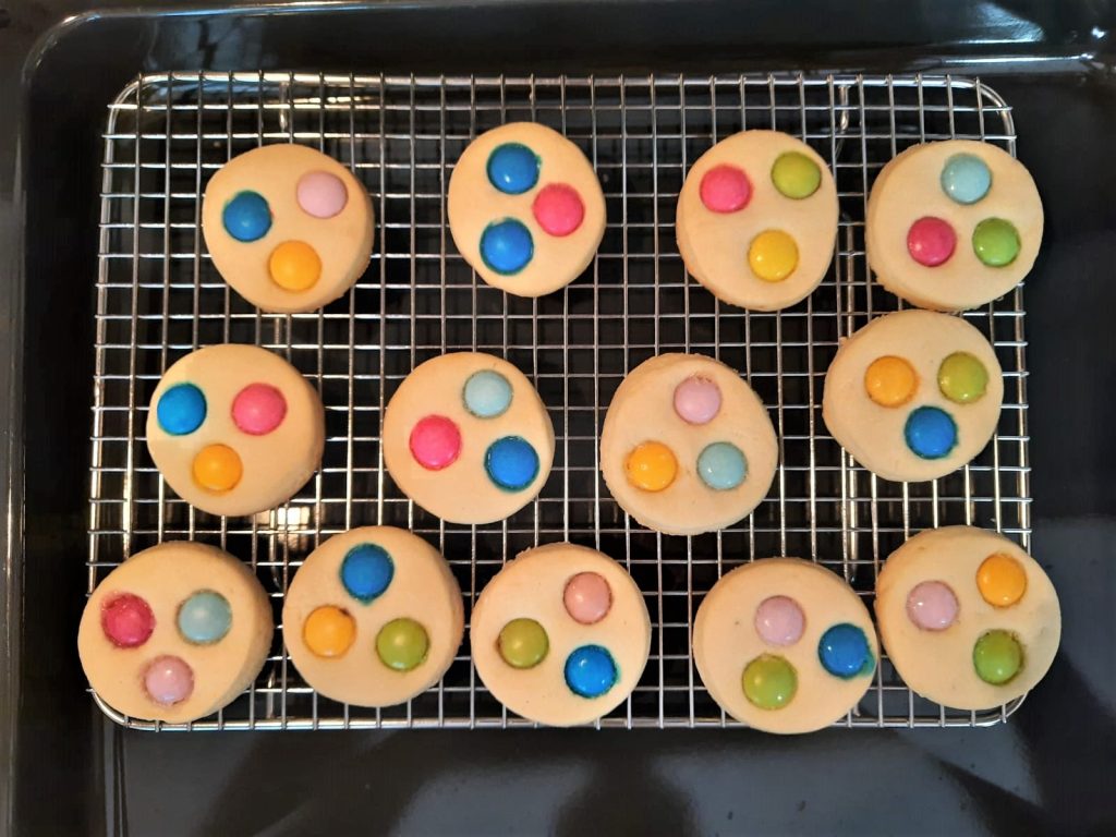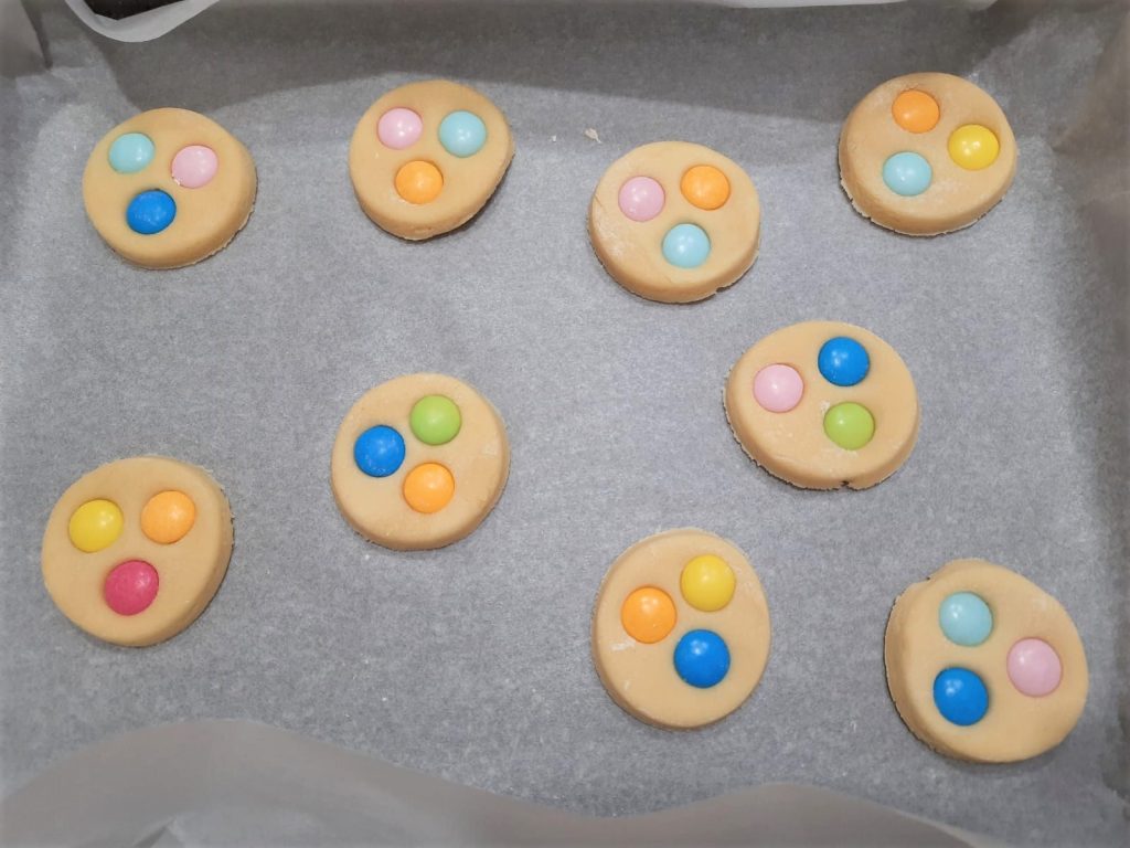 Sur la surface des biscuits, placez 3 confettis de couleur différente, en appuyant pour les enfoncer partiellement dans la pâte. Enfournez pendant environ 12 minutes.