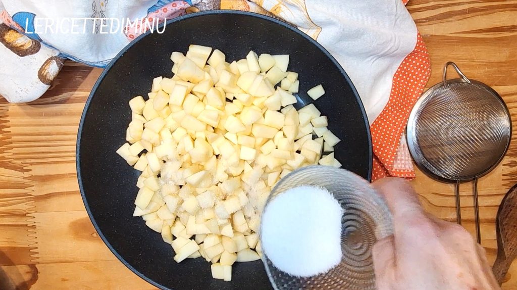 Les couper en morceaux et les placer dans une poêle antiadhésive avec le sucre, la cannelle et le jus filtré d’une orange.