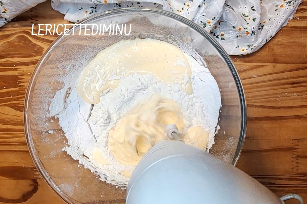 Dans le mélange d’œufs, verser peu à peu la farine en la tamisant et l’incorporer à la pâte, toujours avec les fouets électriques.