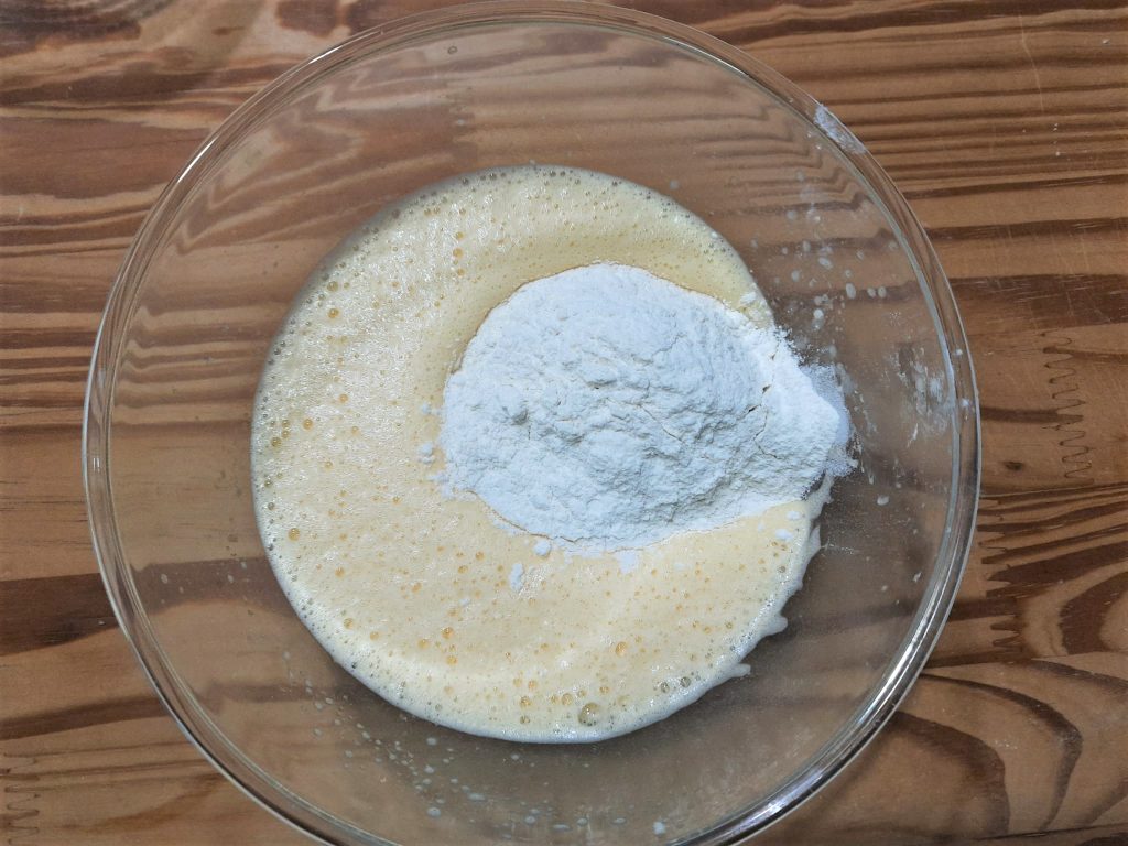 Ajouter le beurre fondu et refroidi et la farine tamisée avec la levure et travailler.