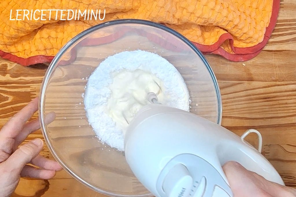 Travaillez avec les fouets électriques la crème fraîche et le sucre glace.