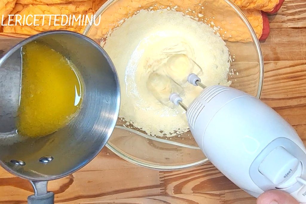 • À part, travailler les jaunes avec le sucre. Lorsque nous aurons un mélange mousseux, en continuant toujours avec les fouets, ajouter le beurre fondu et désormais tiédi.
