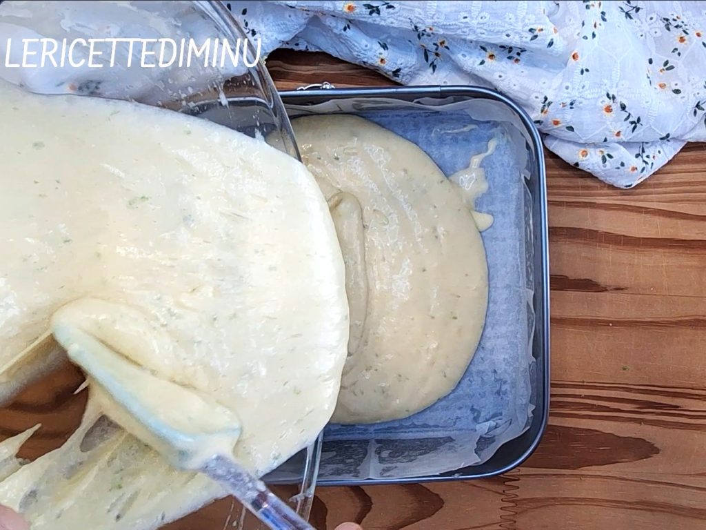 Une fois un mélange homogène obtenu, verser le tout dans un moule à charnière carré 20×20, beurré et fariné ou, comme je l’ai préféré, beurré et recouvert de papier sulfurisé découpé sur mesure.