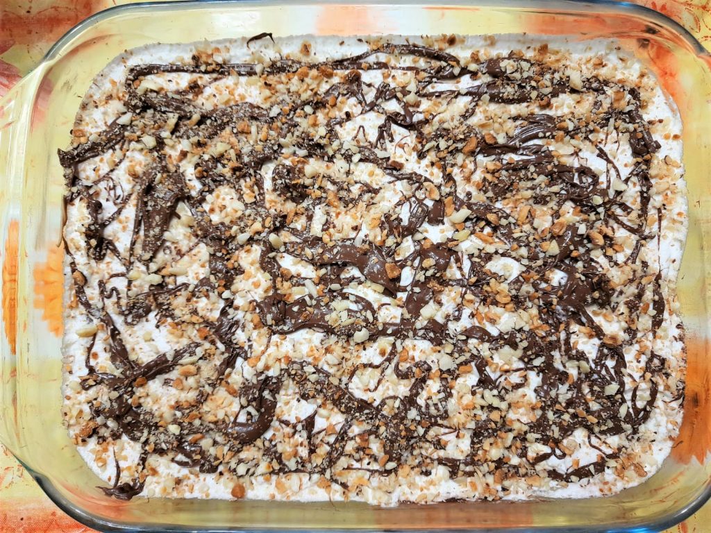 Cette fois, étant la couche finale, répartir la crème aux noisettes également sur la crème et terminer avec les fruits secs.