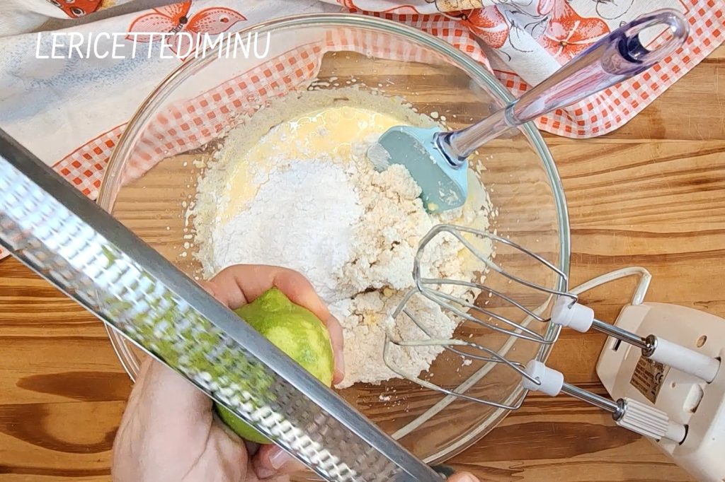 Puis la fécule de pommes de terre, l’amidon de maïs, le zeste râpé d’un citron bio, la vanilline, la levure tamisée et travailler.
