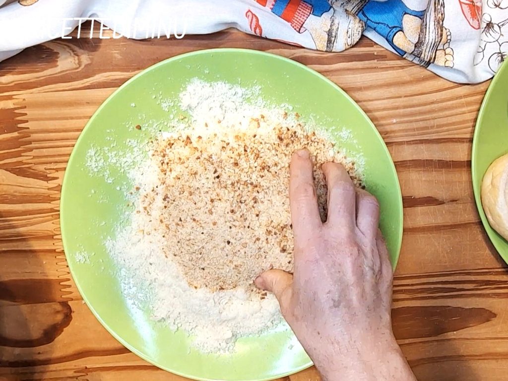 • Émietter la quantité de mie d’environ 5 petits pains au lait et la mélanger avec 80 grammes de chapelure.