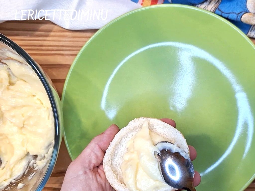 • À l’aide d’une petite cuillère, remplir à votre goût avec l’une de ces crèmes à la fois la calotte et la base du petit pain, puis les réunir en essayant de bien les faire coïncider.