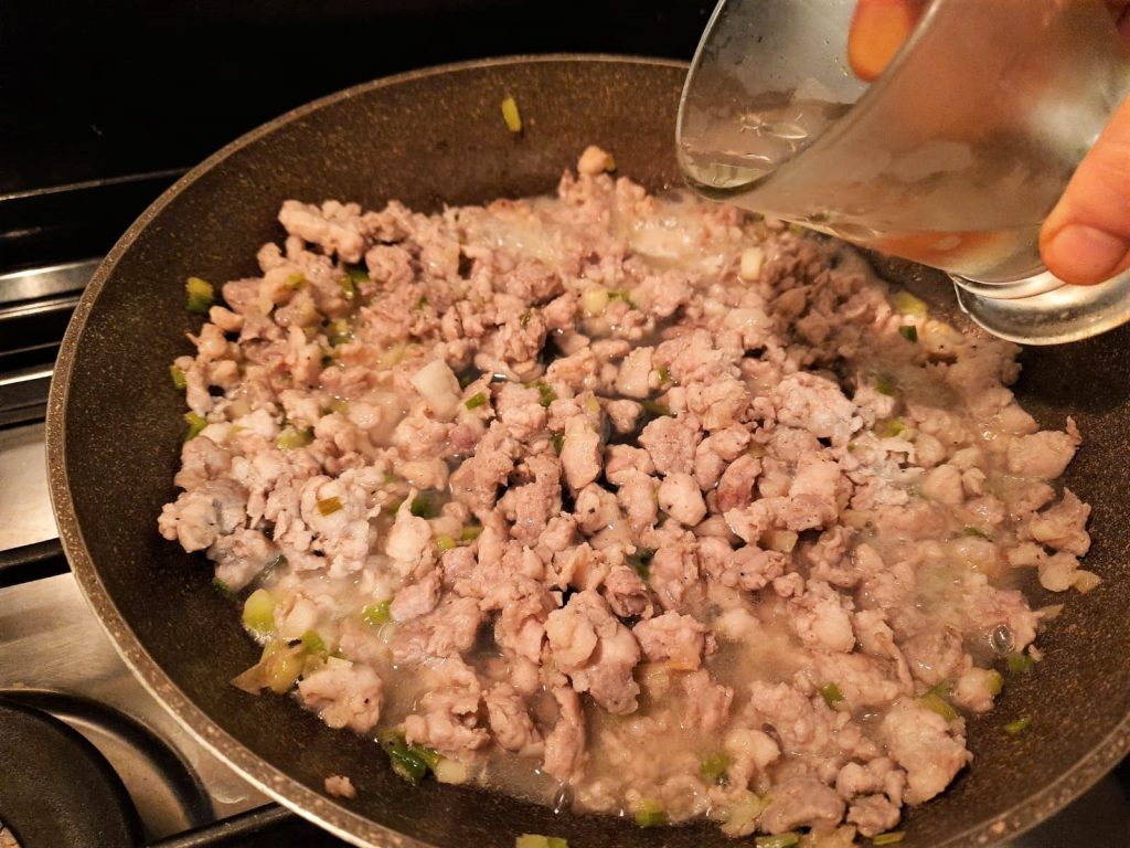 Pendant ce temps, dans une poêle antiadhésive, émincer l’oignon nouveau, y ajouter la saucisse retirée de son boyau et émiettée.
