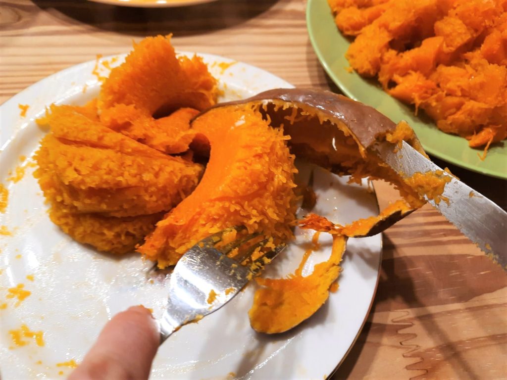 Laisser tiédir tous les ingrédients préparés. Puis enlever la peau de la citrouille.