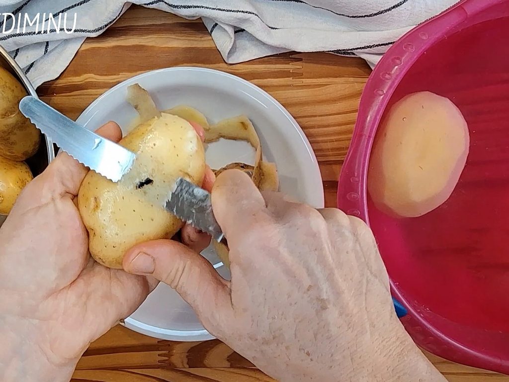 • Pour préparer le maquereau au four avec pommes de terre, commencez par laver et peler les pommes de terre en les plongeant directement dans un bol rempli d’eau.