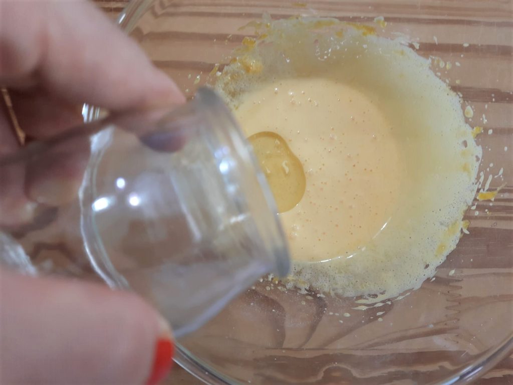 Ajouter l’huile au mélange avec les jaunes et travailler.