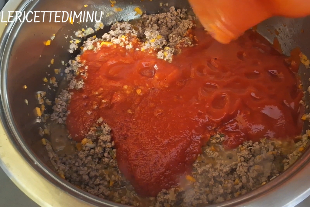 Ajouter la passata de tomate et un litre d’eau, deux feuilles de laurier, une cuillère de concentré de tomate dissous dans un peu d’eau chaude.