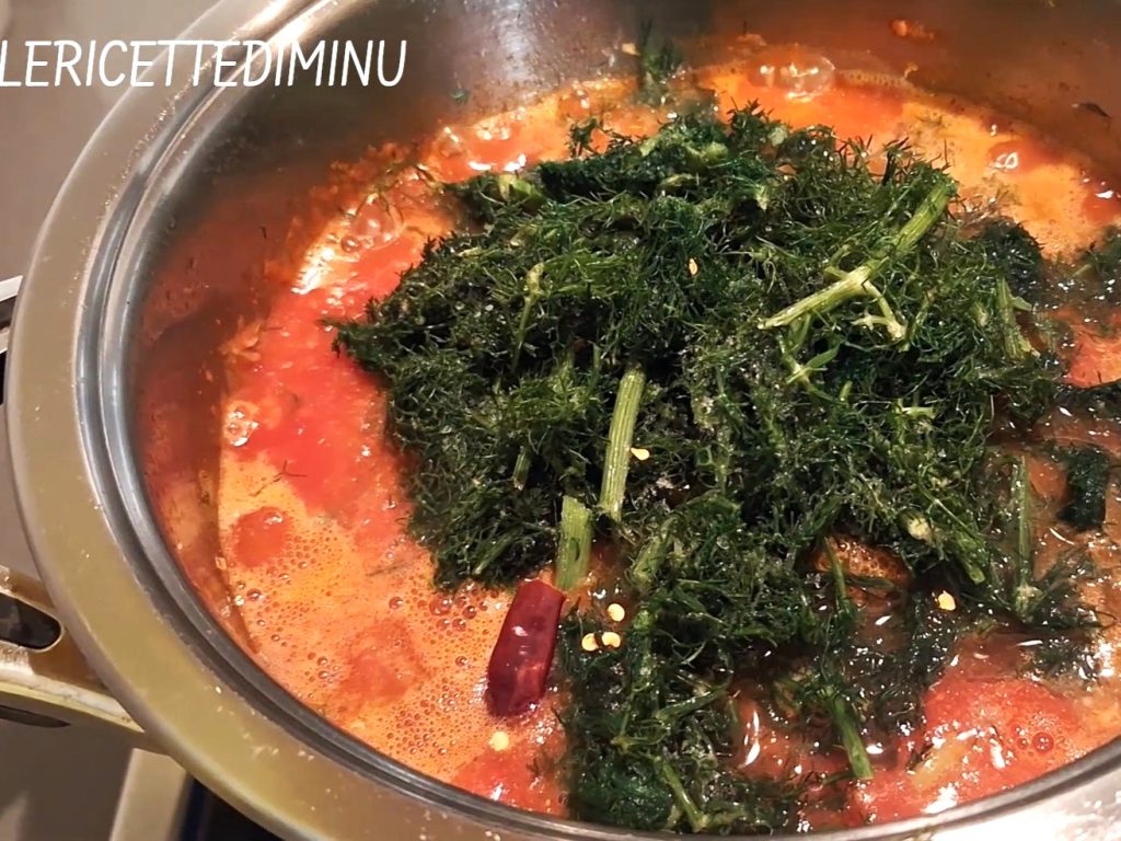 Laissez imprégner quelques minutes, puis ajoutez la purée de tomates, le fenouil en morceaux, le sel et le piment dans la quantité juste pour donner une touche épicée au plat.