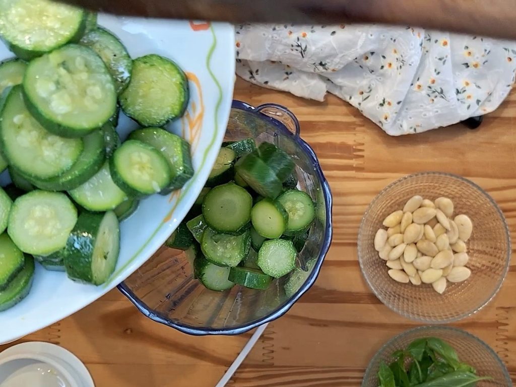 • Quand elles auront tiédi, faire glisser les courgettes dans le blender/mixeur, ajouter les amandes pelées, un riche bouquet de basilic, l’huile d’olive extra vierge et le grana râpé.