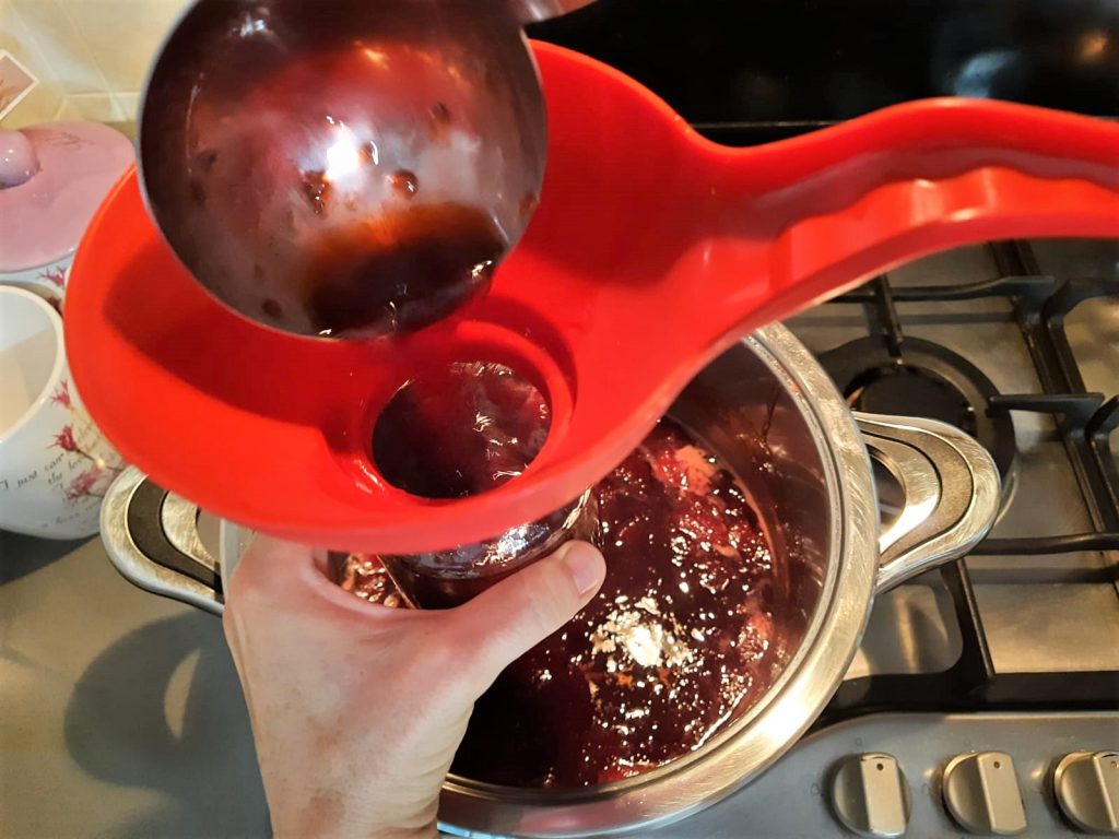Dès que le feu est éteint, remplir les bocaux bien secs avec la confiture chaude. Aidez-vous avec une louche et un entonnoir spécifique pour confitures en laissant au moins un doigt sous le rebord du bocal.