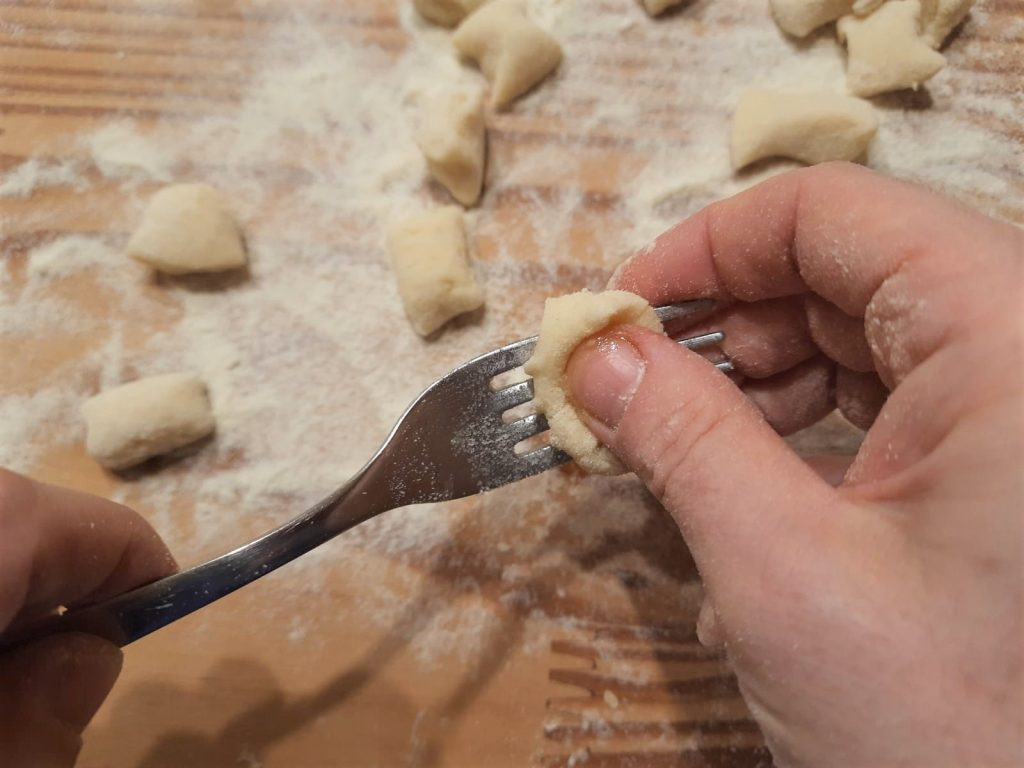 Rouler les morceaux dans une pincée de farine, huiler le pouce et les dents de la fourchette et procéder ainsi à réaliser les gnocchis (voir vidéo).