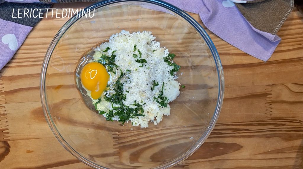 • Ajoutez le persil et l’ail finement hachés au couteau sur une planche à découper, le pecorino râpé, 1 œuf, une pincée de sel et, facultativement, du poivre noir frais moulu.
