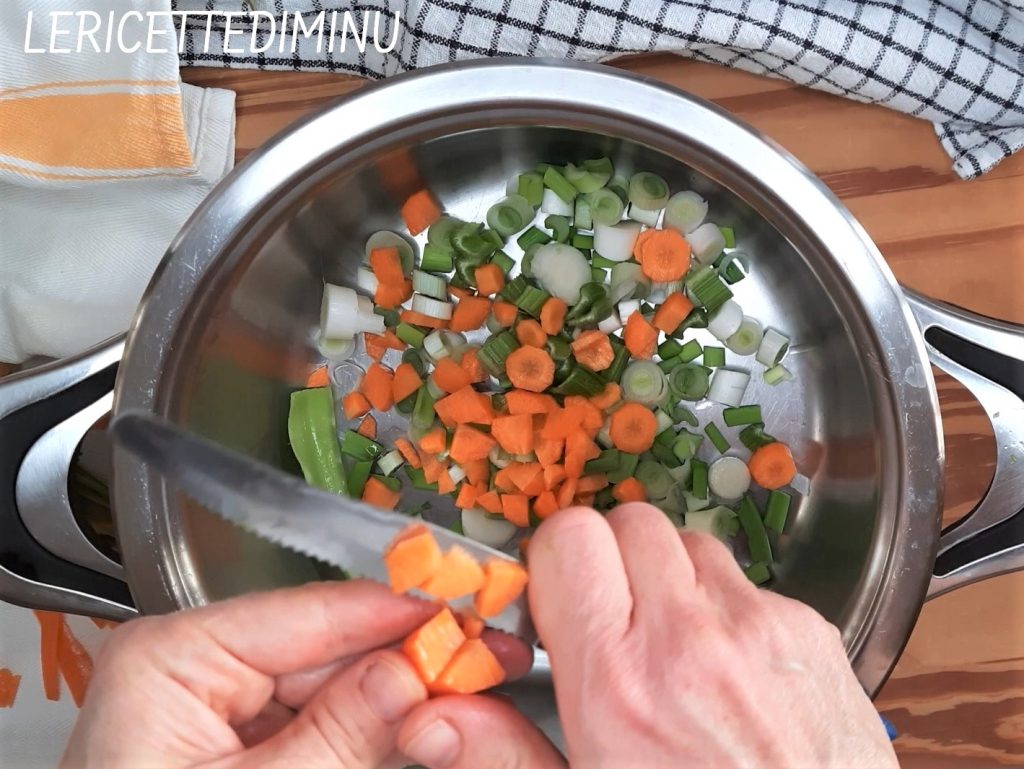 Directement dans la casserole où nous allons cuire la soupe, mettez : oignon (de préférence frais), carotte et céleri finement coupés au couteau.