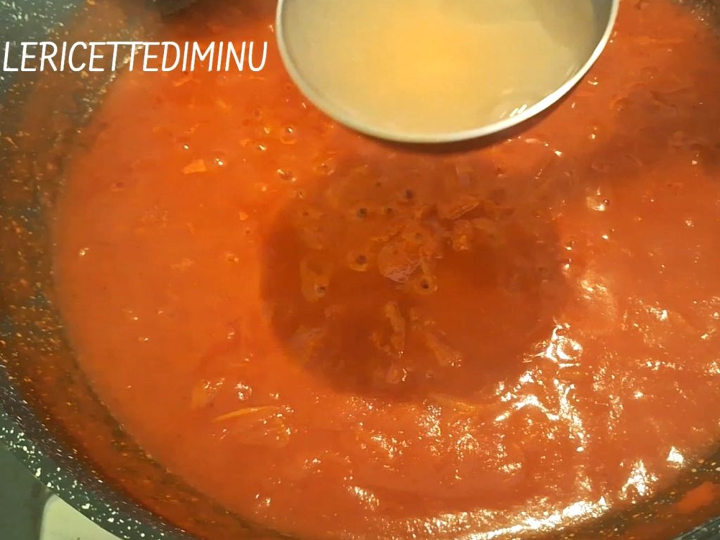 • Quand l’oignon est doré, ajouter dans la poêle environ 400 ml de purée de tomates et 300 ml d’eau.