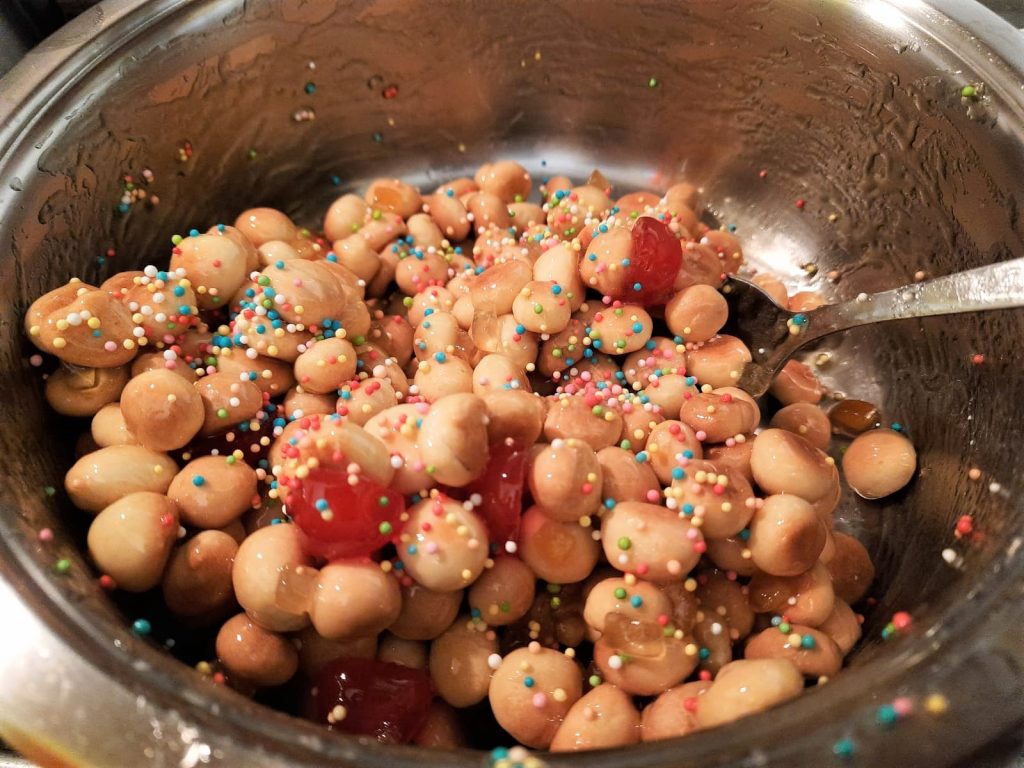Dans l’autre moitié de miel et fruits confits, ajoutez les struffoli frits et remuez après avoir ajouté ici aussi les diavolina.
