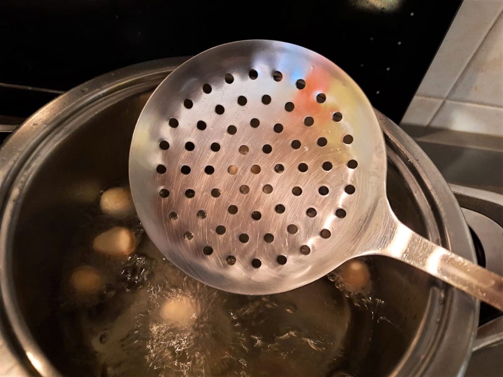 Faites frire quelques struffoli à la fois en gardant la flamme modérée et en les retournant avec une écumoire.