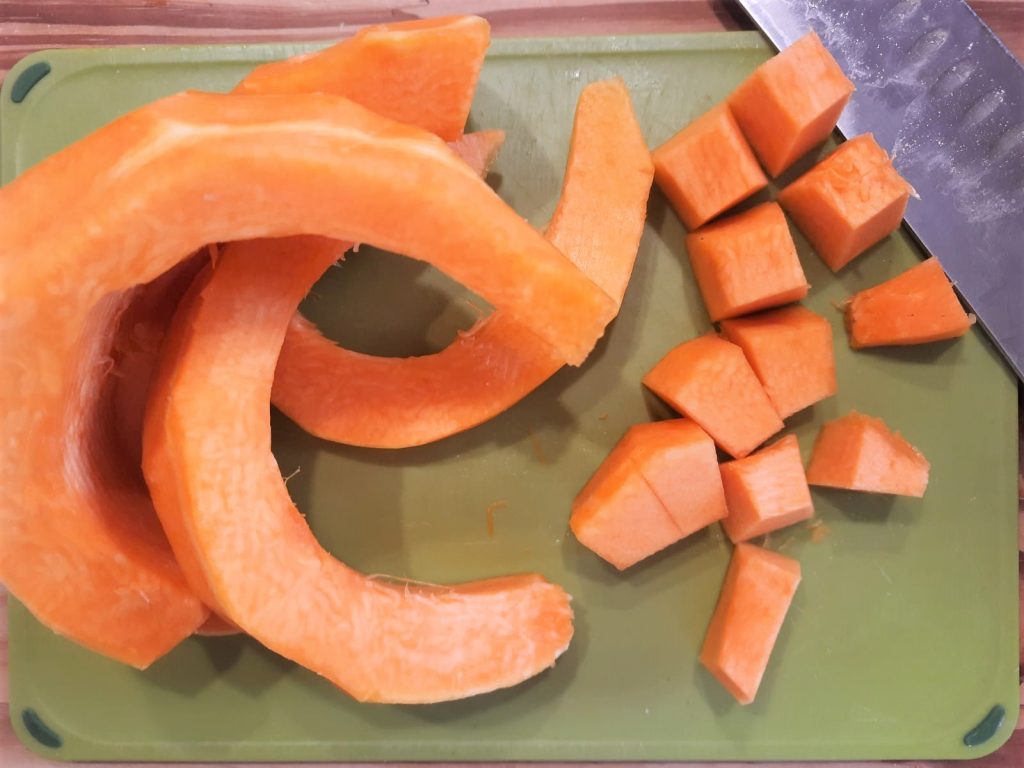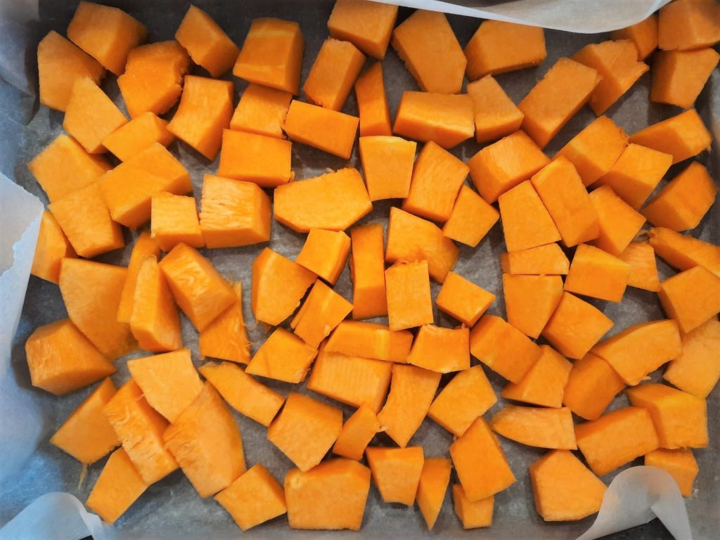 • Pour réaliser la garniture, couper la citrouille en quartiers et enlever la peau, les graines et les filaments internes. Réduire chaque quartier en morceaux tous de même taille si possible et les mettre sur une plaque recouverte de papier cuisson.